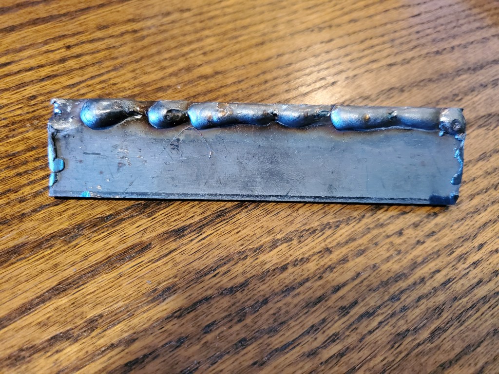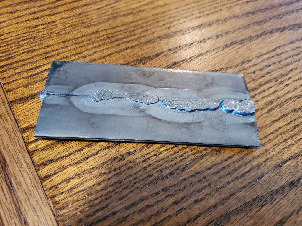 The first “real” weld I attempted was a simple butt weld of two coupons, shown in Figures 1 and 2. I performed this weld at the default feed rate of 280 in/min and voltage of 19V. Welding from left to right, my first weld was too fast to fully penetrate the coupons. The second, third, and fourth attempts penetrated the material, but the third and fourth bits deposited significant material on the back side of the plate (shown in figure 2).