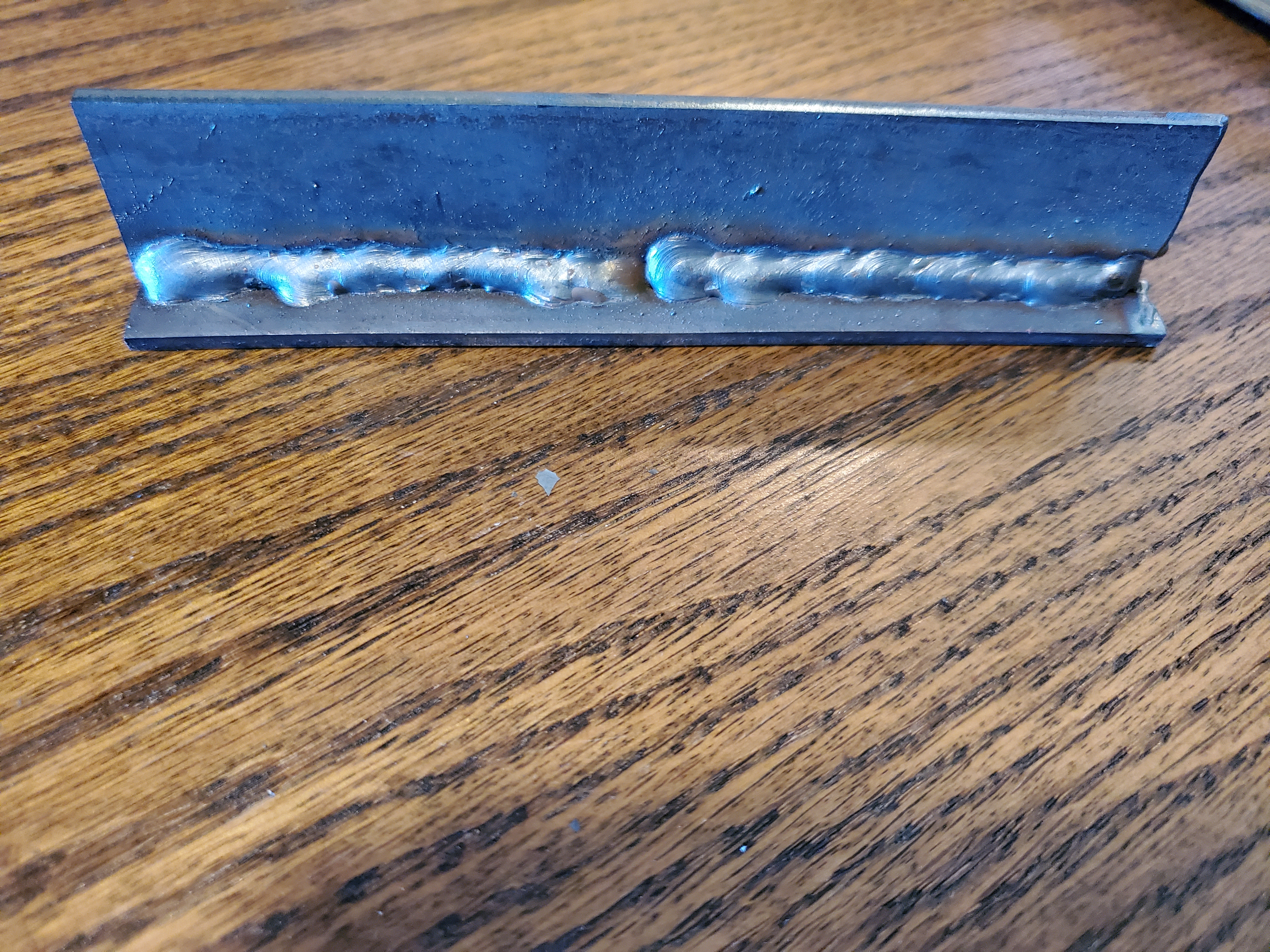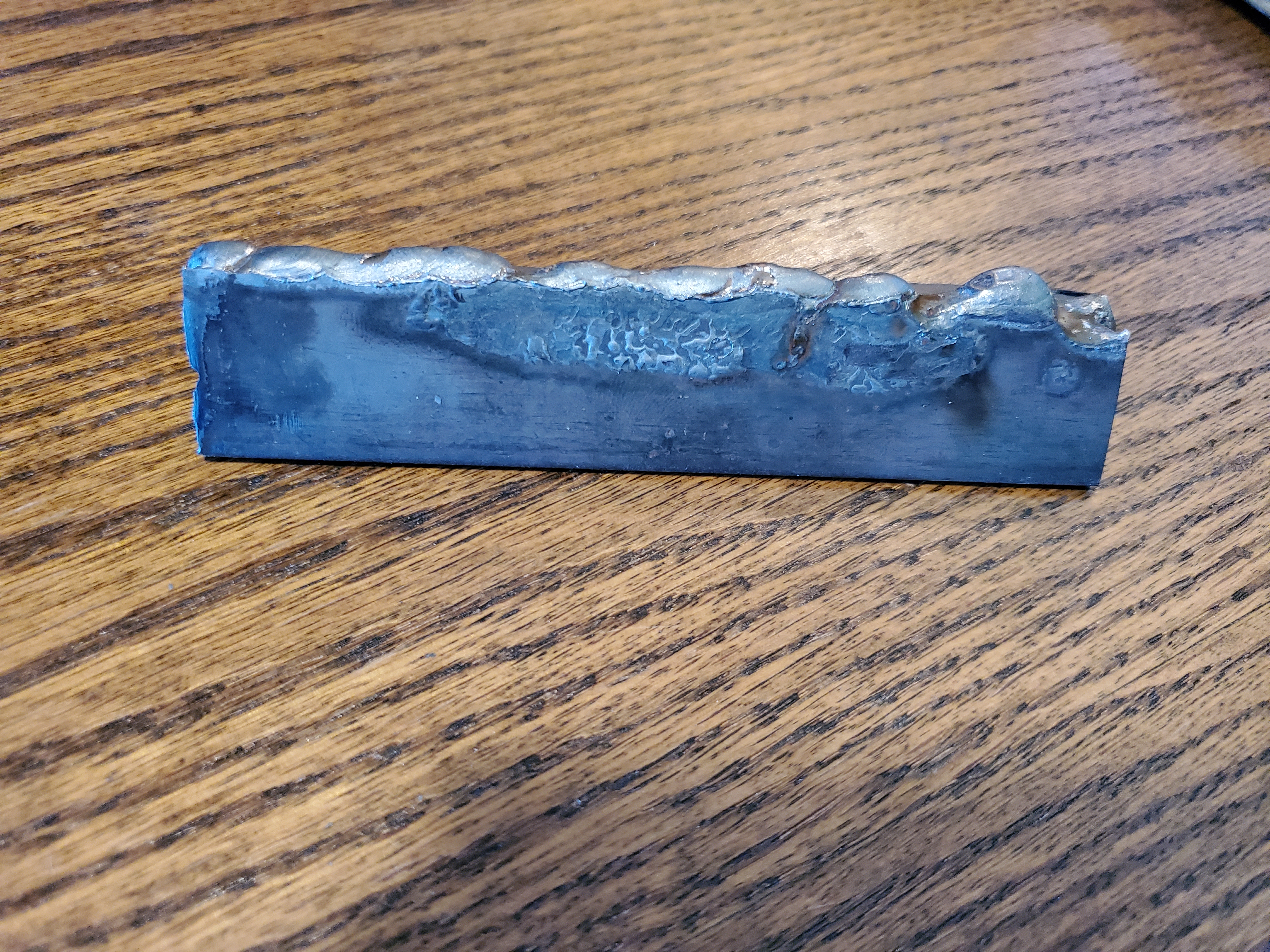 The first “real” weld I attempted was a simple butt weld of two coupons, shown in Figures 1 and 2. I performed this weld at the default feed rate of 280 in/min and voltage of 19V. Welding from left to right, my first weld was too fast to fully penetrate the coupons. The second, third, and fourth attempts penetrated the material, but the third and fourth bits deposited significant material on the back side of the plate (shown in figure 2).